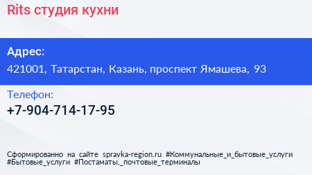 Rits, студия кухни по адресу 421001, Татарстан, Казань, проспект Ямашева, 93 в дальнейшем Организация, размещена в следующих категориях: