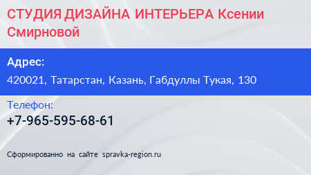СТУДИЯ ДИЗАЙНА ИНТЕРЬЕРА Ксении Смирновой по адресу 420021, Татарстан, Казань, Габдуллы Тукая, 130 в дальнейшем Организация, размещена в следующих категориях: