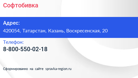 Софтобивка по адресу 420054, Татарстан, Казань, Воскресенская, 20 в дальнейшем Организация, размещена в следующих категориях: