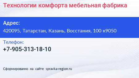 Технологии комфорта, мебельная фабрика по адресу 420095, Татарстан, Казань, Восстания, 100 к9050 в дальнейшем Организация, размещена в следующих категориях: