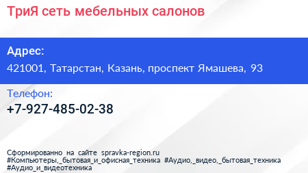 ТриЯ, сеть мебельных салонов по адресу 421001, Татарстан, Казань, проспект Ямашева, 93 в дальнейшем Организация, размещена в следующих категориях:
