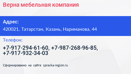 Верна, мебельная компания по адресу 420021, Татарстан, Казань, Нариманова, 44 в дальнейшем Организация, размещена в следующих категориях: