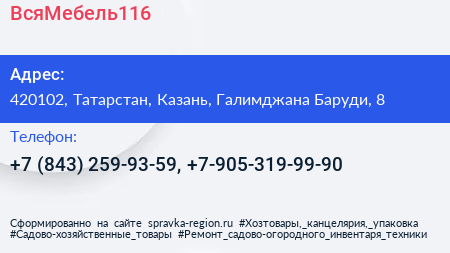 ВсяМебель116 по адресу 420102, Татарстан, Казань, Галимджана Баруди, 8 в дальнейшем Организация, размещена в следующих категориях: