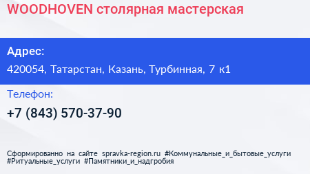 WOODHOVEN, столярная мастерская по адресу 420054, Татарстан, Казань, Турбинная, 7 к1 в дальнейшем Организация, размещена в следующих категориях: