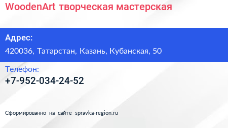 WoodenArt, творческая мастерская по адресу 420036, Татарстан, Казань, Кубанская, 50 в дальнейшем Организация, размещена в следующих категориях: