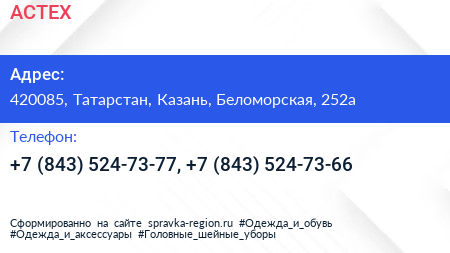 АСТЕХ по адресу 420085, Татарстан, Казань, Беломорская, 252а в дальнейшем Организация, размещена в следующих категориях: