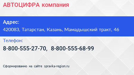 АВТОЦИФРА, компания по адресу 420083, Татарстан, Казань, Мамадышский тракт, 46 в дальнейшем Организация, размещена в следующих категориях:
