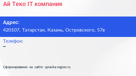 Ай-Теко, IT-компания по адресу 420107, Татарстан, Казань, Островского, 57в в дальнейшем Организация, размещена в следующих категориях: