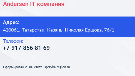 Andersen, IT-компания по адресу 420061, Татарстан, Казань, Николая Ершова, 76/1 в дальнейшем Организация, размещена в следующих категориях: