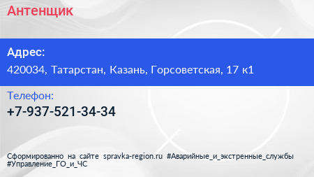 Антенщик по адресу 420034, Татарстан, Казань, Горсоветская, 17 к1 в дальнейшем Организация, размещена в следующих категориях: