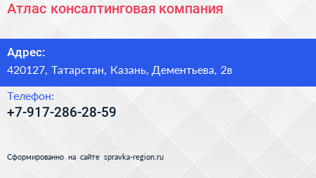 Атлас, консалтинговая компания по адресу 420127, Татарстан, Казань, Дементьева, 2в в дальнейшем Организация, размещена в следующих категориях: