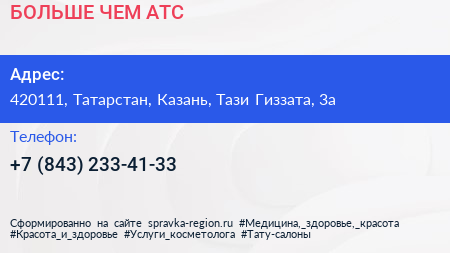 БОЛЬШЕ ЧЕМ АТС по адресу 420111, Татарстан, Казань, Тази Гиззата, 3а в дальнейшем Организация, размещена в следующих категориях: