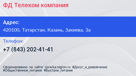 ФД-Телеком, компания по адресу 420100, Татарстан, Казань, Закиева, 3а в дальнейшем Организация, размещена в следующих категориях: