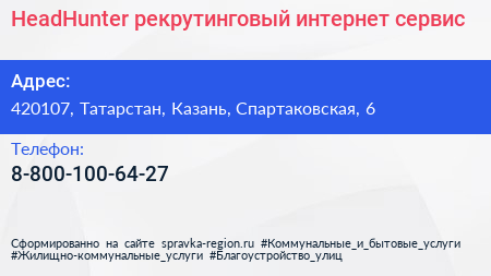 HeadHunter, рекрутинговый интернет-сервис по адресу 420107, Татарстан, Казань, Спартаковская, 6 в дальнейшем Организация, размещена в следующих категориях: