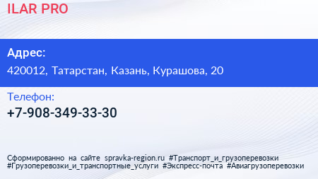 ILAR PRO по адресу 420012, Татарстан, Казань, Курашова, 20 в дальнейшем Организация, размещена в следующих категориях: