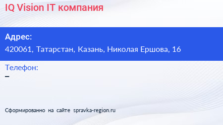 IQ Vision, IT-компания по адресу 420061, Татарстан, Казань, Николая Ершова, 16 в дальнейшем Организация, размещена в следующих категориях: