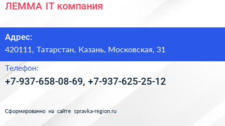 ЛЕММА, IT-компания по адресу 420111, Татарстан, Казань, Московская, 31 в дальнейшем Организация, размещена в следующих категориях: