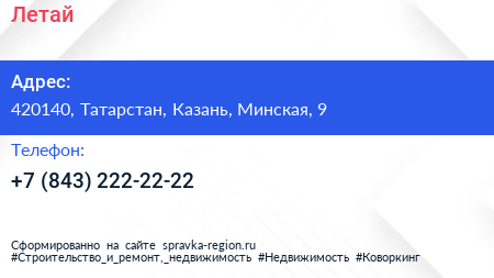 Летай по адресу 420140, Татарстан, Казань, Минская, 9 в дальнейшем Организация, размещена в следующих категориях: