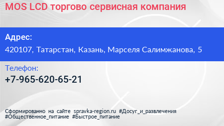 MOS-LCD, торгово-сервисная компания по адресу 420107, Татарстан, Казань, Марселя Салимжанова, 5 в дальнейшем Организация, размещена в следующих категориях:
