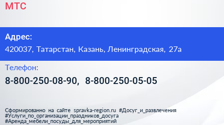 МТС по адресу 420037, Татарстан, Казань, Ленинградская, 27а в дальнейшем Организация, размещена в следующих категориях: