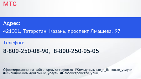 МТС по адресу 421001, Татарстан, Казань, проспект Ямашева, 97 в дальнейшем Организация, размещена в следующих категориях: