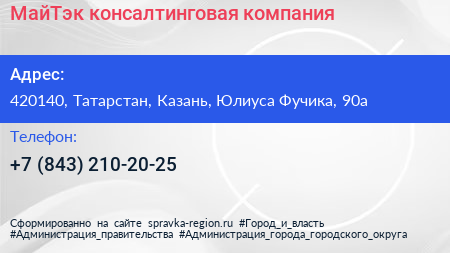 МайТэк, консалтинговая компания по адресу 420140, Татарстан, Казань, Юлиуса Фучика, 90а в дальнейшем Организация, размещена в следующих категориях: