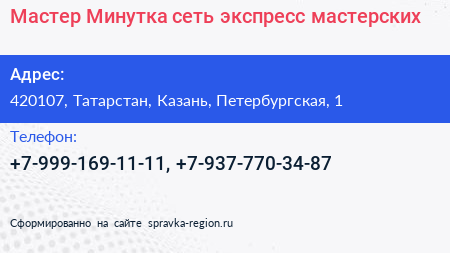 Мастер Минутка, сеть экспресс-мастерских по адресу 420107, Татарстан, Казань, Петербургская, 1 в дальнейшем Организация, размещена в следующих категориях: