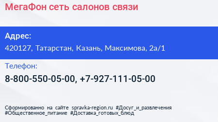 МегаФон, сеть салонов связи по адресу 420127, Татарстан, Казань, Максимова, 2а/1 в дальнейшем Организация, размещена в следующих категориях: