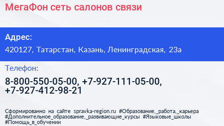 МегаФон, сеть салонов связи по адресу 420127, Татарстан, Казань, Ленинградская, 23а в дальнейшем Организация, размещена в следующих категориях: