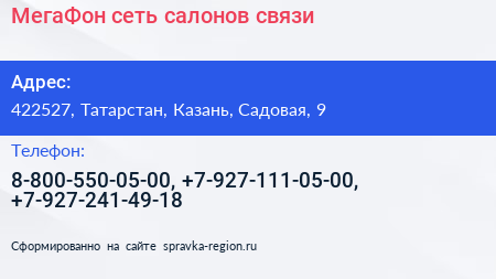 МегаФон, сеть салонов связи по адресу 422527, Татарстан, Казань, Садовая, 9 в дальнейшем Организация, размещена в следующих категориях: