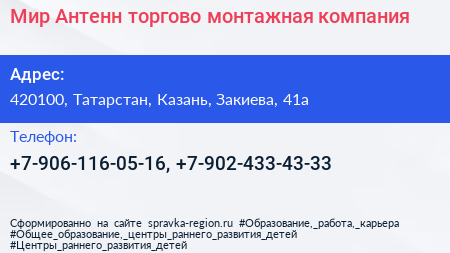 Мир Антенн, торгово-монтажная компания по адресу 420100, Татарстан, Казань, Закиева, 41а в дальнейшем Организация, размещена в следующих категориях: