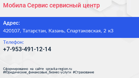 Мобила Сервис, сервисный центр по адресу 420107, Татарстан, Казань, Спартаковская, 2 к3 в дальнейшем Организация, размещена в следующих категориях: