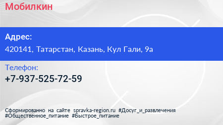 Мобилкин по адресу 420141, Татарстан, Казань, Кул Гали, 9а в дальнейшем Организация, размещена в следующих категориях: