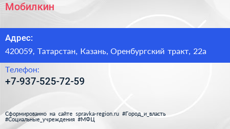 Мобилкин по адресу 420059, Татарстан, Казань, Оренбургский тракт, 22а в дальнейшем Организация, размещена в следующих категориях: