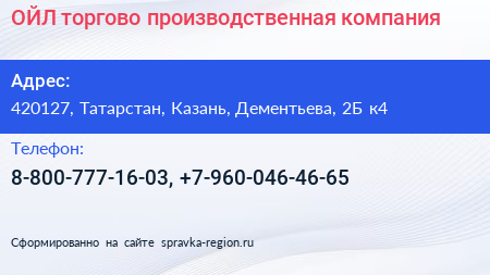 ОЙЛ, торгово-производственная компания по адресу 420127, Татарстан, Казань, Дементьева, 2Б к4 в дальнейшем Организация, размещена в следующих категориях:
