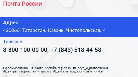 Почта России по адресу 420066, Татарстан, Казань, Чистопольская, 4 в дальнейшем Организация, размещена в следующих категориях: