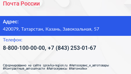 Почта России по адресу 420079, Татарстан, Казань, Завокзальная, 57 в дальнейшем Организация, размещена в следующих категориях: