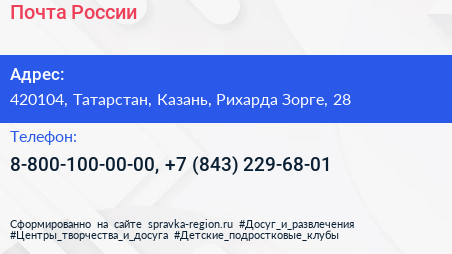 Почта России по адресу 420104, Татарстан, Казань, Рихарда Зорге, 28 в дальнейшем Организация, размещена в следующих категориях:
