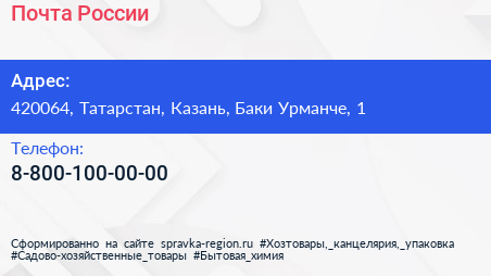 Почта России по адресу 420064, Татарстан, Казань, Баки Урманче, 1 в дальнейшем Организация, размещена в следующих категориях: