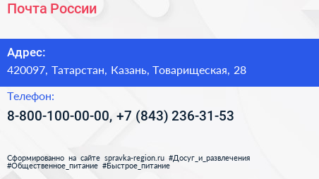 Почта России по адресу 420097, Татарстан, Казань, Товарищеская, 28 в дальнейшем Организация, размещена в следующих категориях: