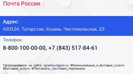 Почта России по адресу 420124, Татарстан, Казань, Чистопольская, 23 в дальнейшем Организация, размещена в следующих категориях: