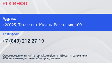 РГК ИНФО по адресу 420095, Татарстан, Казань, Восстания, 100 в дальнейшем Организация, размещена в следующих категориях: