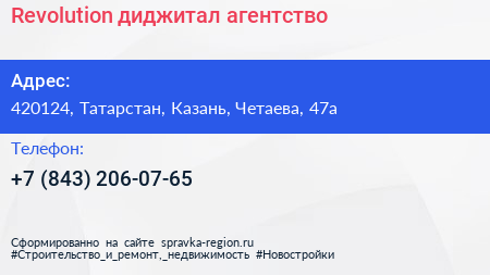 Revolution, диджитал-агентство по адресу 420124, Татарстан, Казань, Четаева, 47а в дальнейшем Организация, размещена в следующих категориях: