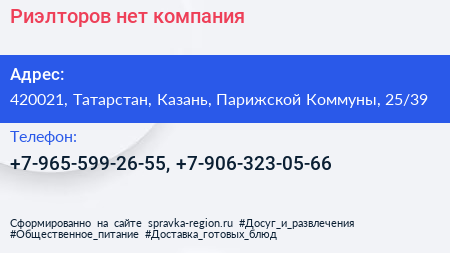 Риэлторов.нет, компания по адресу 420021, Татарстан, Казань, Парижской Коммуны, 25/39 в дальнейшем Организация, размещена в следующих категориях: