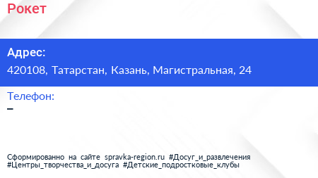 Рокет по адресу 420108, Татарстан, Казань, Магистральная, 24 в дальнейшем Организация, размещена в следующих категориях: