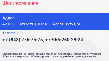 Для связи с организацией воспользуйтесь номером телефона: +7 (843) 276-75-75, +7-966-260-29-24. Пн: c 08:30-17:30, Вт: c 08:30-17:30, Ср: c 08:30-17:30, Чт: c 08:30-17:30, Пт: c 08:30-17:30, Сб: c 08:30-14:00, Вс: выходной, вы можете обратиться в эту организацию.