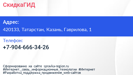 СкидкаГИД по адресу 420133, Татарстан, Казань, Гаврилова, 1 в дальнейшем Организация, размещена в следующих категориях: