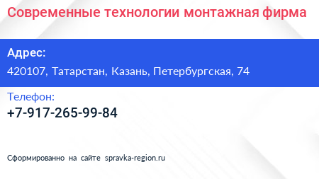 Современные технологии, монтажная фирма по адресу 420107, Татарстан, Казань, Петербургская, 74 в дальнейшем Организация, размещена в следующих категориях: