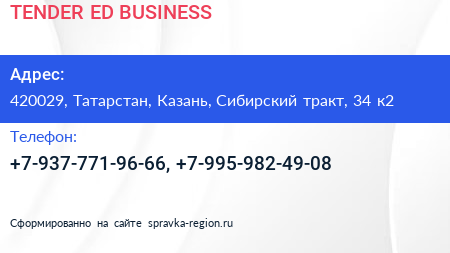 TENDER ED BUSINESS по адресу 420029, Татарстан, Казань, Сибирский тракт, 34 к2 в дальнейшем Организация, размещена в следующих категориях: