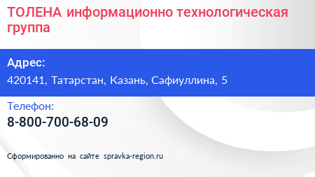 ТОЛЕНА, информационно-технологическая группа по адресу 420141, Татарстан, Казань, Сафиуллина, 5 в дальнейшем Организация, размещена в следующих категориях: